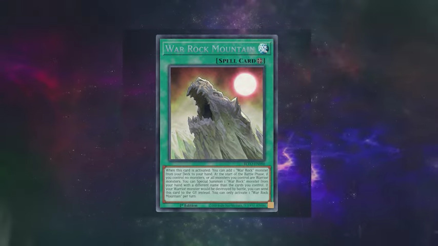 When this card is activated: You can add 1 “War Rock” monster from your Deck to your hand. At the start of the Battle Phase, if you control no monsters, or all monsters you control are Warrior monsters: You can Special Summon 1 “War Rock” monster from your hand with a different name than the cards you control. If your Warrior monster would be destroyed by battle, you can send this card to the GY instead. You can only activate 1 “War Rock Mountain” per turn.